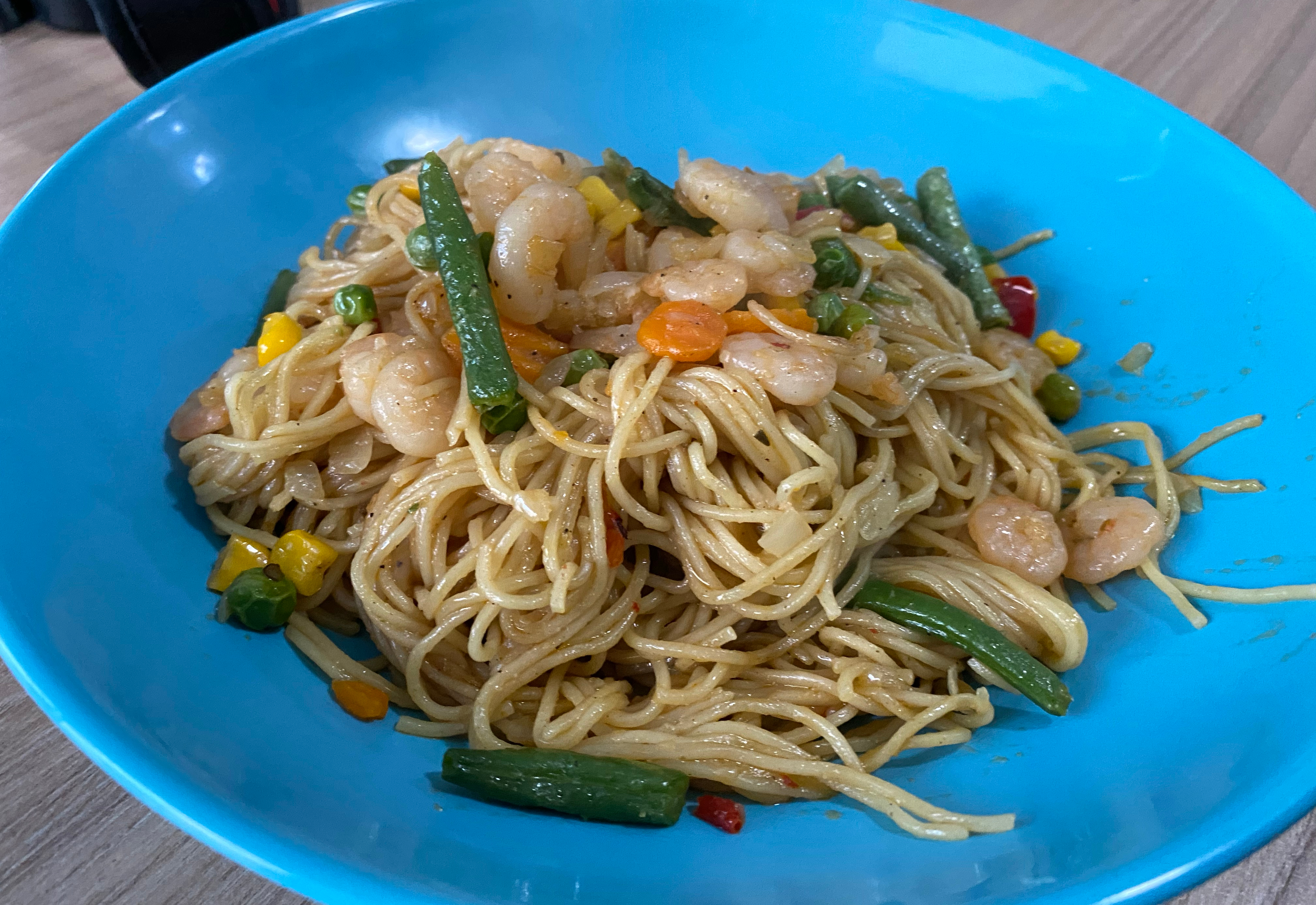 Start off by sautéing the onion, garlic, shrimp in some olive oil. Then add the mixed vegetables, and seasonings. Mix everything together and let cook until vegetables are the hardness you desire. Add noodles and soy sauce, fry a bit more and done.