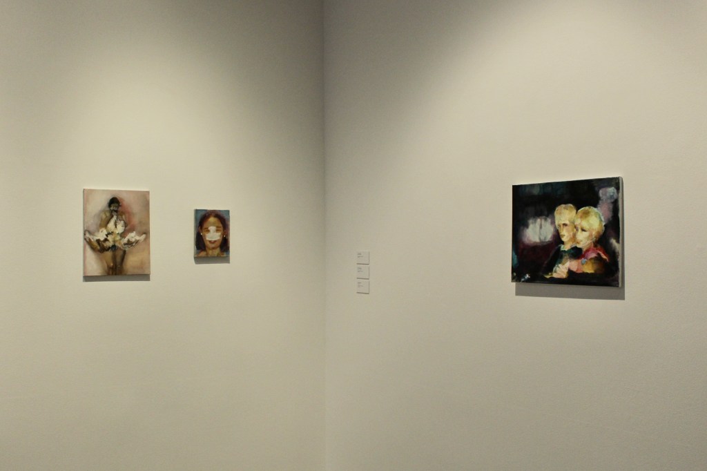 There are some sculptures on the wall that look like folded pieces of paper, but my eyes are immediately drawn to this painting, Moment Decisiv/Page Turner by Talia Maidenberg. It’s absolutely vulgar and I love it. The embrace, the folds of the skin, the top figure’s mouth around the breast of the bottom figure. Are they both women? Are either of them women?