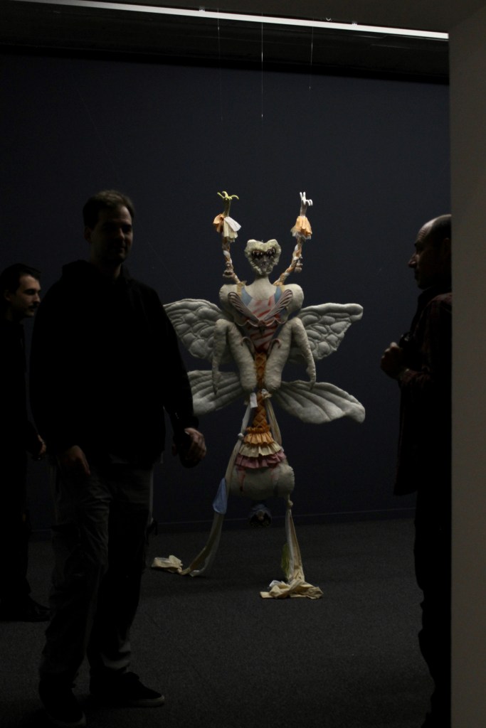 If I am looking at Maidenberg’s paintings behind me hangs a thick red curtain embroidered with gold line art of a woman sprawled horizontally. I do not go to look behind the curtain, instead I follow the big moth sculpture into the back, where my favourite piece (an installation) waits for me.