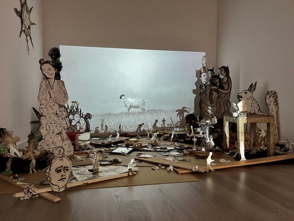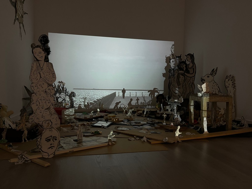 I have barely passed through the first room – where I viewed 3 paintings (4?) and a tapestry (a big red curtain) that has a human form outlined. The woman is sprawled horizontally across the sheet, when I am beckoned into a room where an installation is set up. a projector sits on the floor and plays a black and white movie along with soundtrack and everything. The half of the room with the projector is empty, but the other half is filled with pieces of wood and drawings of men and women. a suitcase is filled with paper dolls. A giant mouse (a scary mickey mouse) and a wolf? rabbit? The cartoon drawings that would otherwise take you back to a nostalgic childhood ( I say nostalgic because the floor is littered with suitcases, medals, icons of st Mary – basically things you would find in your grandmother’s house or attic, the mood is helped by the constant flow of short videos depicting moments in Romanian life. images that remind me of my childhood and riding the train to see my grandmother in Dr. Tr. Severin or across the country to Constanta. The paper dolls that are set up in front of the video cast shadows onto the wall the video is projected on. I have yet to read the artist’s description but for me this installation is a bitter nostalgic childhood. I have sat for a while have watched but I am yet to see the end of the loop – or to catch the frame when I sat down. At one point there is a clip of a fire pyre, it feels like the drawings, the paper dolls will burn up with the wood like easy kindling.