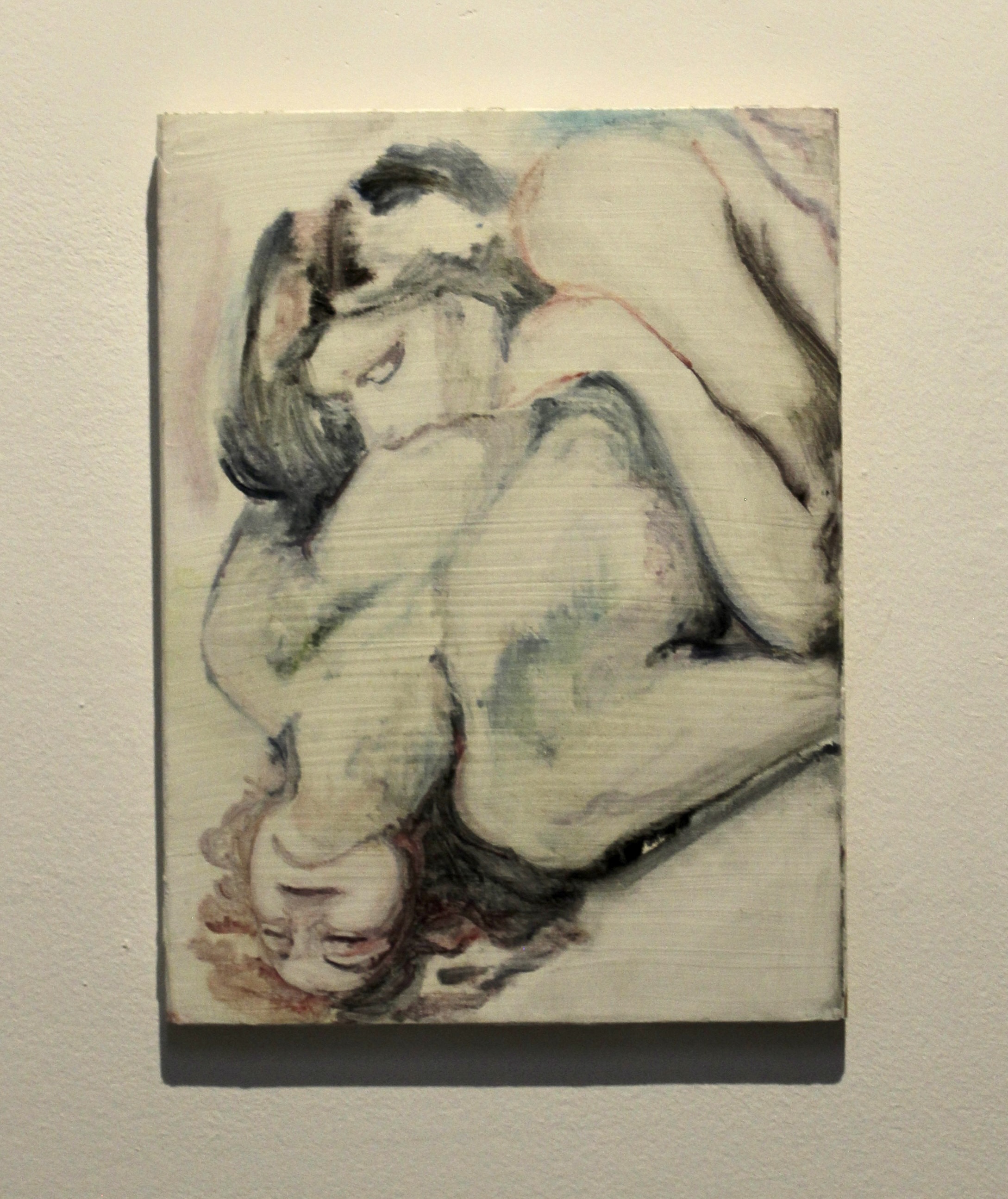 There are some sculptures on the wall that look like folded pieces of paper, but my eyes are immediately drawn to this painting, Moment Decisiv/Page Turner by Talia Maidenberg. It’s absolutely vulgar and I love it. The embrace, the folds of the skin, the top figure’s mouth around the breast of the bottom figure. Are they both women? Are either of them women?